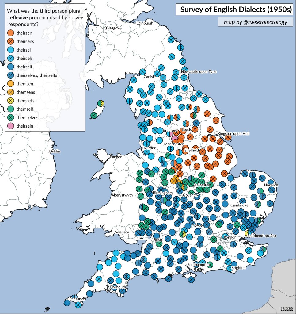 Just to mess with your head, I’m sharing this interesting map with different forms of the 3rd person plural reflexive pronoun used in various parts of England. You might wonder whether anyone actually uses the “proper” forms of these pronouns…