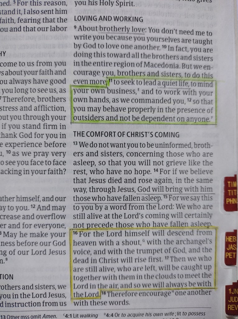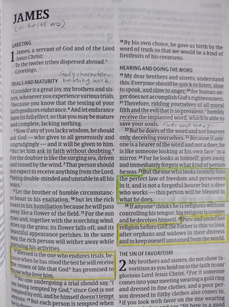 If youโre curious to know about my Bible mark-up system, Iโve tried to simplify it as much as I could. Any notes are written using a mechanical pencil (0.7mm HB – neat and easy to erase, if necessary). I do highlights using yellow and green crayons: yellow for memorable passages concerning doctrine or anything else that catches my eye; green for practical everyday life concerns, health and wellbeing, ethics et sim.